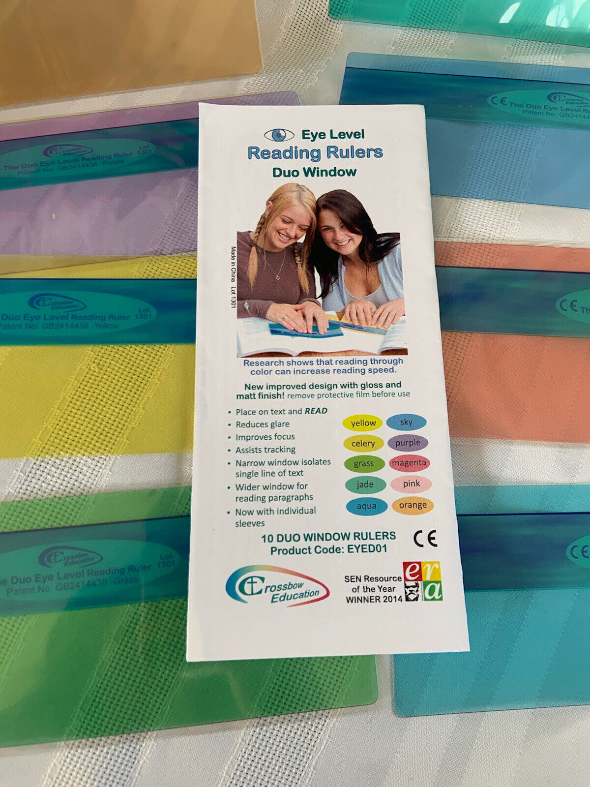 The Eye Level Reading Ruler is a coloured overlay filter and text highlighter about the size of an eight-inch ruler. This SEN resource helps reduce the symptoms of Visual Stress and is Dyslexia friendly by helping the dyslexic reader keep on the correct line as they are reading.